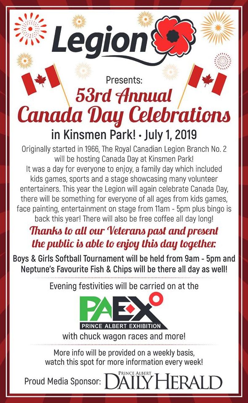 The Royal Canadian Legion’s 53rd Annual Canada Day Celebration will be held in Kinsmen Park July 1 with evening festivities at the PA Ex.