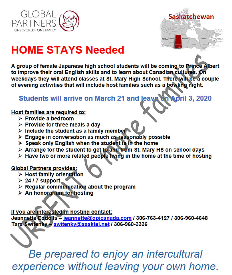 Global Partners in Prince Albert urgently needs 7 families for Home Stays for female Japanese High School Students.