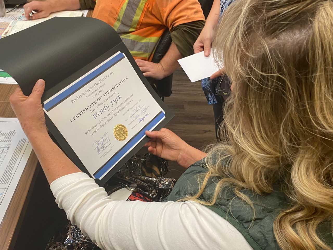 Wendy Fyrk received a certificate of appreciation from council as well as a $500 donation and a new catch pole. All of Fyrk’s expenses including transportation come out of her own pocket.