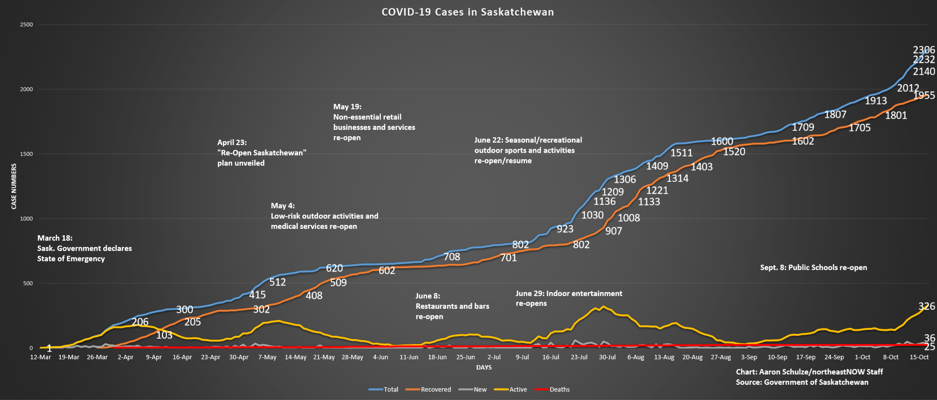 There are now 2,306 reported cases, 326 of which are considered active, the highest total in the province. A total of 1,955 recoveries have been reported, to date.