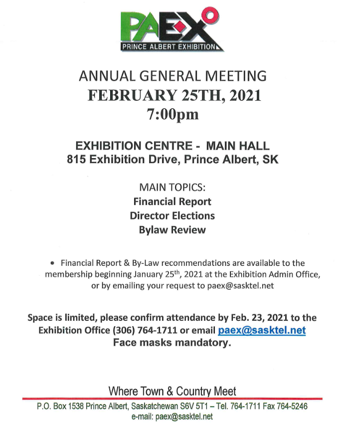 The Prince Albert Exhibition Association is having its Annual General Meeting February 25 at the Exhibition Centre Main Hall.