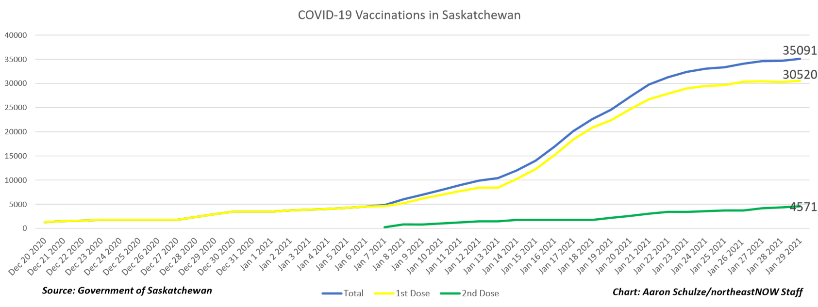 The Saskatchewan Health Authority administered 308 doses of the COVID-19 vaccine yesterday. This brings the provincial total of vaccines given to 35,091 in Saskatchewan.