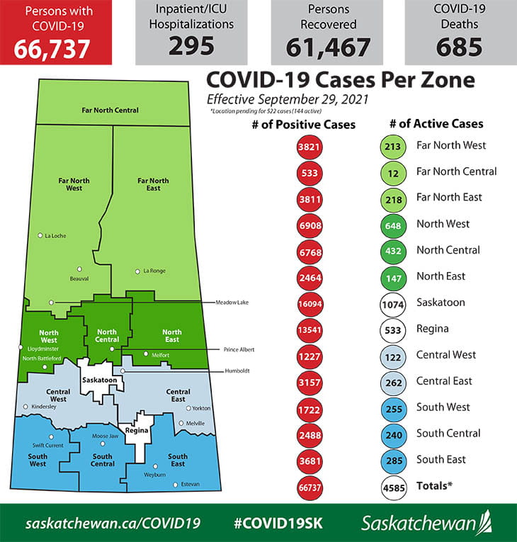 The daily cases reported today include 85 per cent of cases among unvaccinated individuals and three new deaths reported today. The provincial death count is now at 685 Saskatchewan residents with COVID-19 who have died.