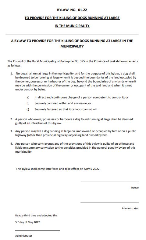 Dogs that have been a continual problem and are going into neighbouring yards is the reason the RM of Porcupine Plain adopted a bylaw this spring that allowed a landowner to shoot the dog if needed.