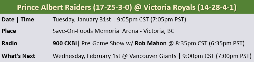 The Prince Albert Raiders (17-25-3-0) are on the island for tonight’s matchup where they shoot for three-in-a-row against the Victoria Royals (14-28-4-1) at the Save-On-Foods Memorial Arena.