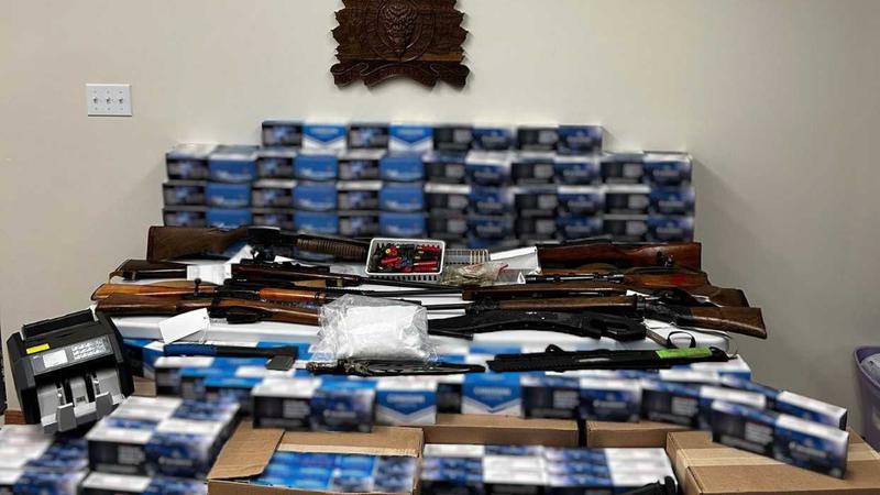 Officers located and seized approximately 110,000 illegal cigarettes, one kilogram of morphine powder, eight firearms, including a semi-automatic model, as well as magazines for the semi-automatic firearm.