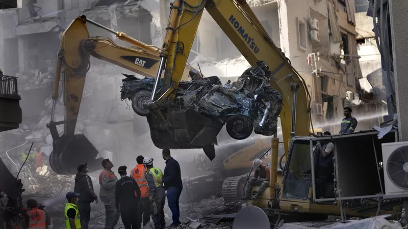An excavator removes a destroyed car as rescue workers gather at the site of an Israeli airstrike that hit central Beirut, Lebanon, Saturday, Nov. 23, 2024. (AP Photo/Hussein Malla)