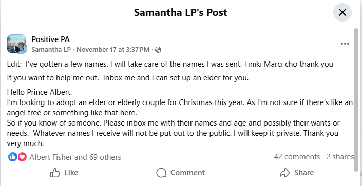 The original post Samantha Plunz put up asking about elderly people she could ‘adopt’ for the holidays for a meal and a gift.Samantha Plunz made the post expecting to hear about one or two elderly persons that could use some company this year for the holidays, but instead she’s received a ton of suggestions for elderly folks as well as a ton of people coming forward to help.