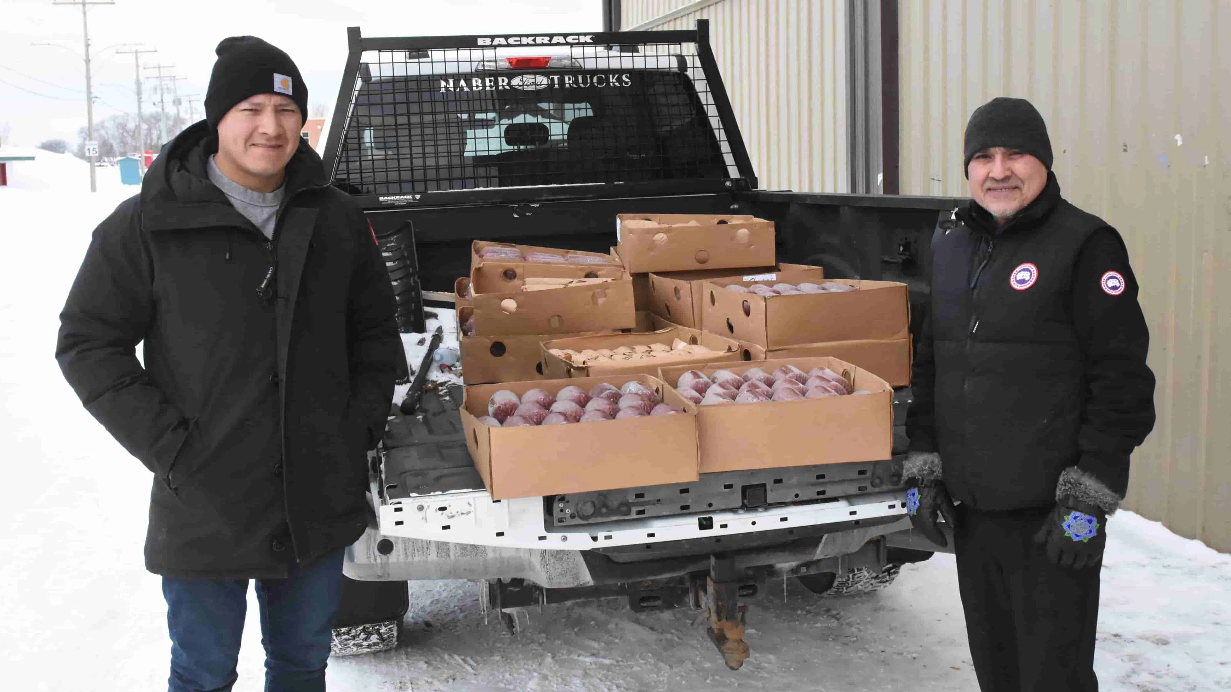 Floyd Cook (left), a Land Based Coordinator with the PAGC, and Vincent Brittain, Director for Urban Services and the Relatives’ Lodge, stand next to the 1,300 pounds of moose meat that was harvested during a successful hunt near Porcupine Plain in January. (Image Credit: Logan Lehmann/paNOW)
