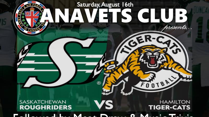 ANAVETS are hosting an event watching Riders vs Tiger Cats August 16 with Meat Draws and Music Trivia to follow.See the poster for details.