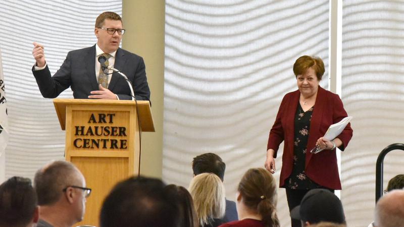 Reporter Susan McNeil talks about Premier Scott Moe and Finance Minister Donna Harpauer's visit to P.A. at a Chamber luncheon Friday.
