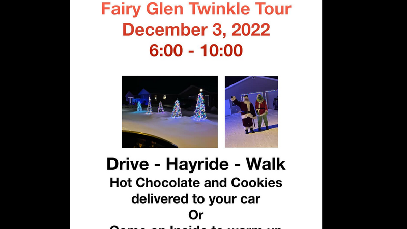 The community of Fairy Glen is hosting its Twinkle Tour December 3 from 6 - 10:00 p.m.You can drive, go on a hayride (weather permitting) or walk.See the poster for details.