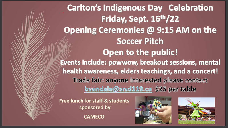 Carlton's Indigenous Day Celebration will be Sept. 16th/22:9:15 AM Grand Entry (Soccer Pitch)9:15 AM Trade fair (in Cafeteria) 10:30 AM Powwow (outside - soccer pitch)10:30 AM Bannock on a stick (outs...